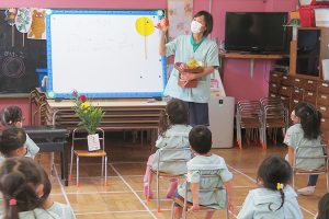 放送による司会の先生と園長先生のお話のあと、各クラスの担任の先生から、満月、半月、三日月などお月様のお話、秋の花や果物などお供え物についてのお話がありました。