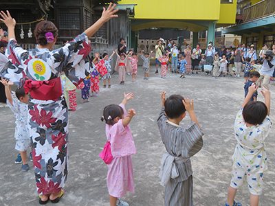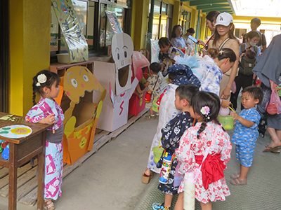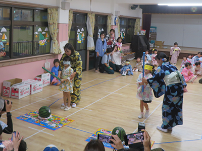 720()の夕方、浴衣や甚平を着た園児、浴衣姿の先生方が園庭に集まって、夕涼み会が開催されました。最初は年少組です。園児たちは、練習してきた盆踊りを披露し、先生方によるさまざまなゲームを楽しみました。続いて年中組も、盆踊りやゲームで夏の夕方を満喫しました。最後に年長組が盆踊りを披露していたとき、雨雲が広がってきました。年長組ならではのスイカ割りは、急きょ園舎内に場所を移して実施する運びとなりました。2階ホールでスイカ割りに挑戦した園児たちは、1階の3教室に移したゲームを楽しみました。