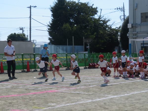 10月13日(日)、雲1つない青空が広がった馬込小学校の校庭にて、瑞穂幼稚園の運動会が開催されました。昨年に続き今年も小学校の校舎の増築工事が行われている関係で、使える校庭の広さが例年よりも狭くなっています。そのため、昨年同様本部の正面のスペースは立ち入り禁止となり、「おもいやり席」を除く保護者席は立ち見となりました。また、校庭が狭いために保護者の参加競技を割愛することとなり、今年の運動会も昼食をはさまずお昼に終了するプログラムで実施しました。